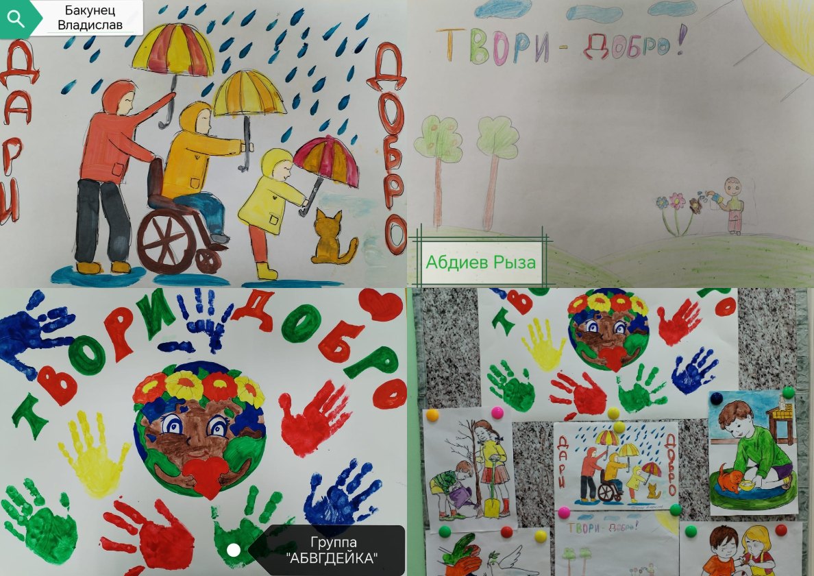 Дети нарисовали рисунки, так как видят добро своими глазами. Победителями конкурса стали - Абдиев Рыза и Бакунец Владислав. В заключении конкурса, группа "АБВГДЕЙКА", нарисовала коллективный рисунок "ТВОРИ ДОБРО"